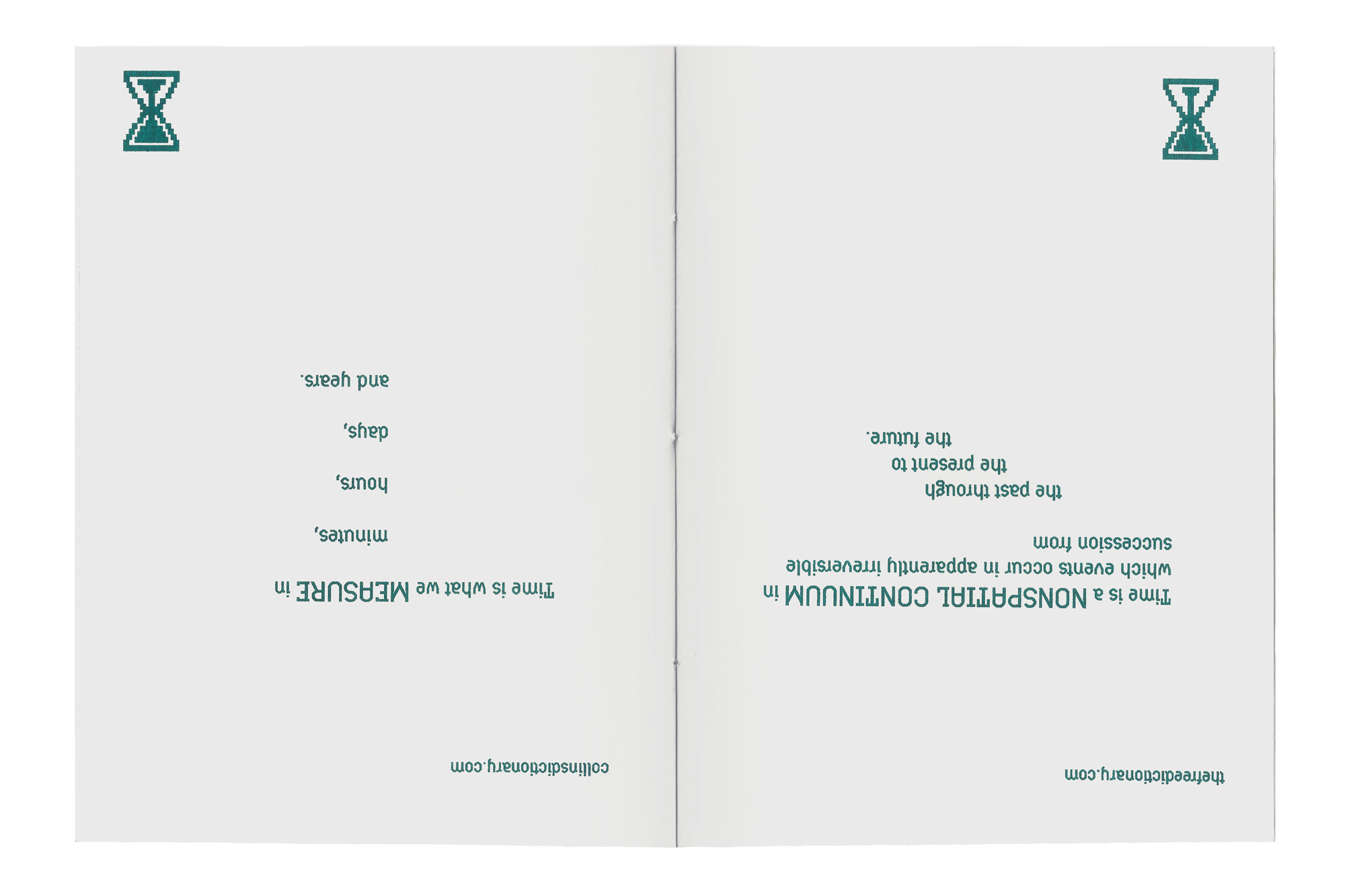 “Time” is a book I designed in my Independent Publishing course at Pratt. I was required to create a twelve-page booklet surrounding the theme of “time.” Reflecting my personal trouble with defining time, I used each page of my book to study different definitions of the concept from various dictionaries and websites. I also designed my own set of pixelated hourglass icons to use as markers rather than using page numbers. To embrace the physical form of the book, the text flips upside down, forcing the reader to turn the book halfway through, therefore flipping the hourglass so that it never ends.The final book is 5.40″ x 7.20″ and was printed on a Risograph with teal ink. The pamphlet binding was done by hand using white thread to blend into the paper, a white text stock.