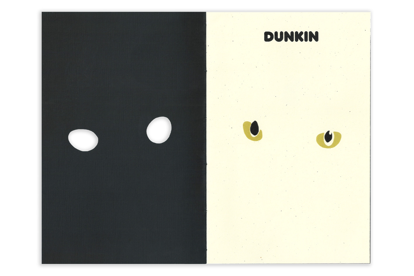 “Dunkin” is a book I created in my Independent Publishing course at Pratt. For this project, I was required to design and construct an eight-page, pamphlet stitched booklet with a cover, acting as a portrait of any chosen subject. Naturally, I chose to capture my cat’s playful personality through my design.The final book is 5.25″ x 8″ and contains two different types of paper. The cover is made from a black classic linen cover stock and the inside is laser-printed on matte milkweed text stock. The binding of the signature was done by hand with embroidery thread, allowing a strand to hang in the back inside cover to elevate the experience. To add to the curiosity and fun, the book includes hand cut windows to interact with the imagery.